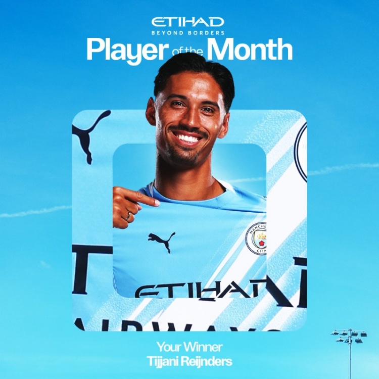 3轮1球1助攻!曼城官方:27岁新援中场赖因德斯当选8月最佳球员