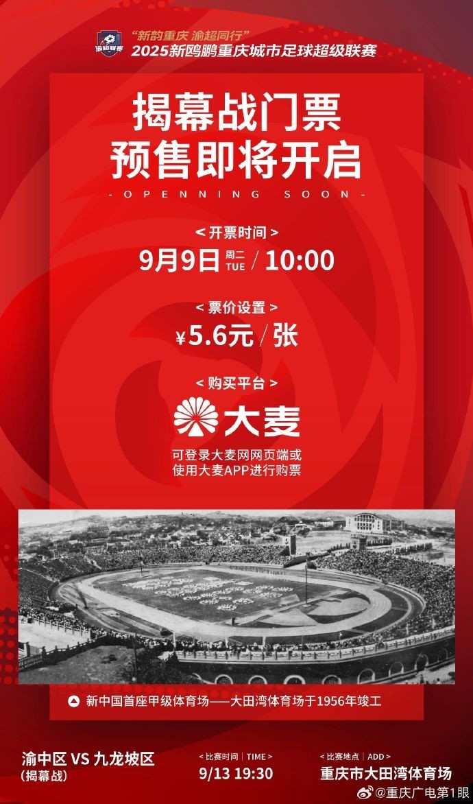 9月8日讯 据“重庆广电第1眼”报道,9月9日上午10点,渝超首场比赛渝中区对战九龙坡区门票开售,每张5.6元。现场观赛...