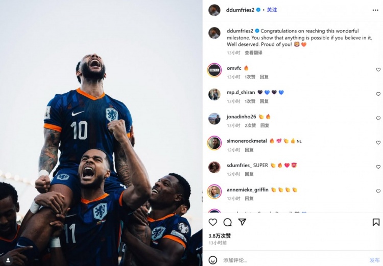 助攻德佩头槌破门!邓弗里斯社媒:祝贺你达成里程碑,为你骄傲
