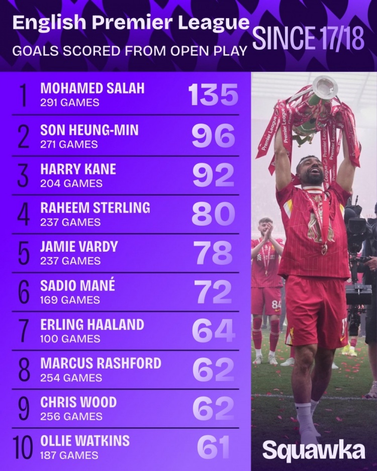近9年英超运动战进球榜:萨拉赫135球领跑,孙兴慜96球、凯恩92球