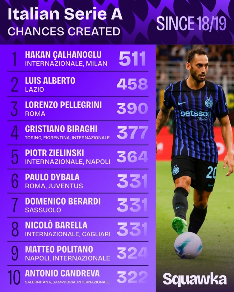 9月7日讯 《转会市场》统计了18-19赛季以来的意甲创造机会情况,恰尔汗奥卢独自领跑。18-19赛季以来意甲创造机会榜...