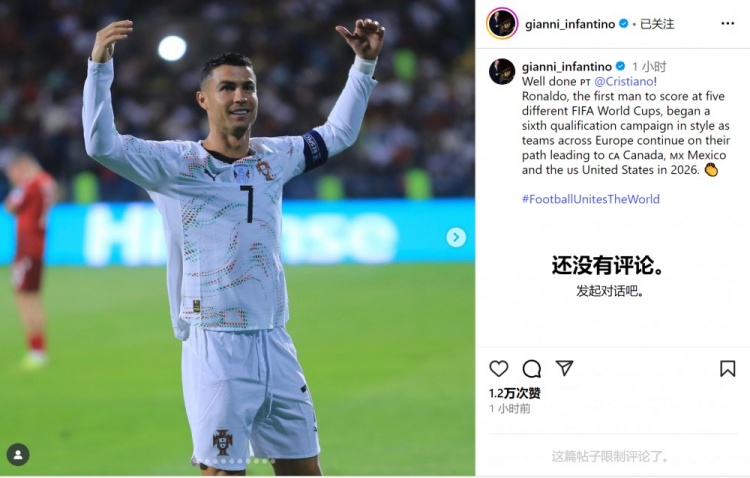 因凡蒂诺社媒:干得漂亮,C罗以出色表现开启第6次世预赛征程
