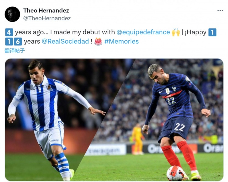 9月7日讯 特奥更新社媒动态,纪念法国队首秀4周年,并为皇家社会庆生。特奥社媒晒出自己身穿法国队和皇家社会球衣的照片,配...