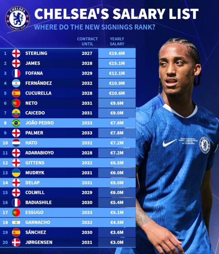 德转列切尔西队内年薪榜:斯特林1960万居首,仅5人超千万欧