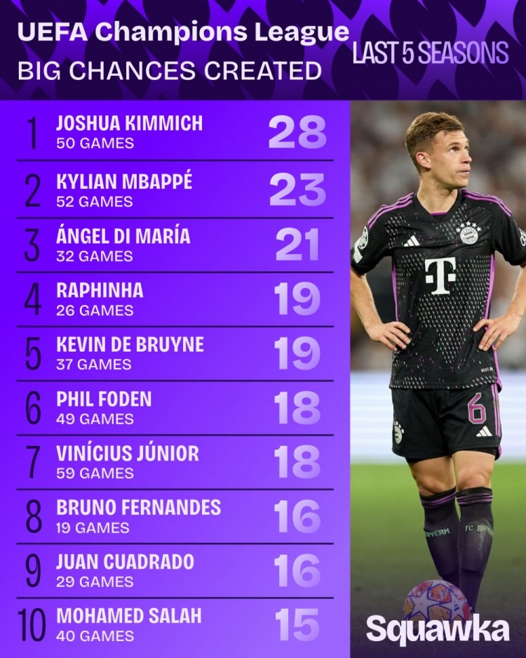 9月7日讯 squakwa统计了近5个赛季的欧冠创造重大机会情况,拜仁中场基米希独自领跑,B费的效率则是前十最高。近5年...