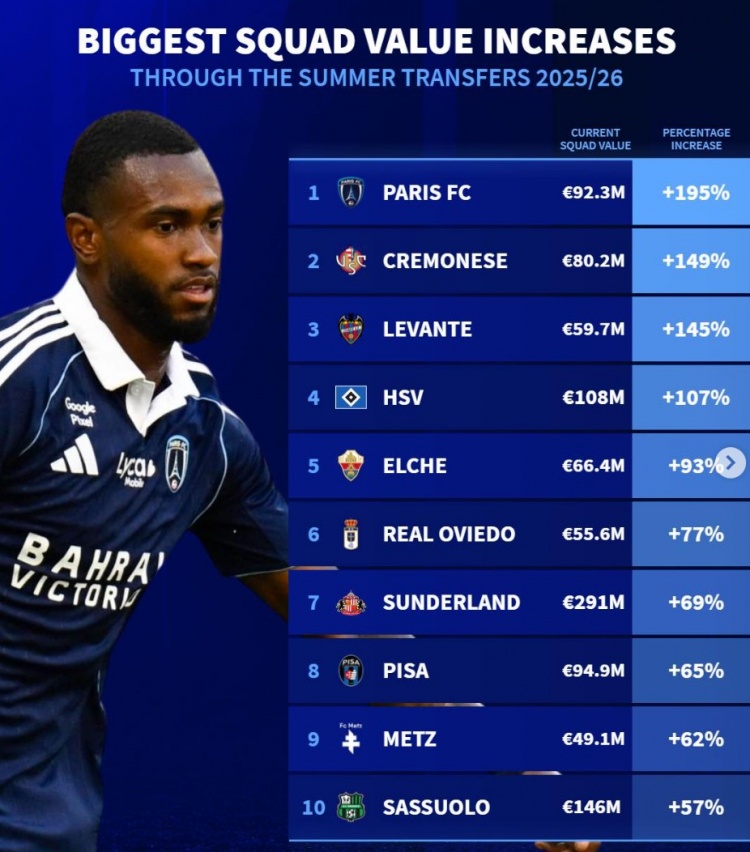 9月7日讯 《转会市场》统计了今夏转会窗过后的总身价上升比例情况,多家升班马霸榜。德转列今夏身价上升比例榜:欧元1.巴黎...