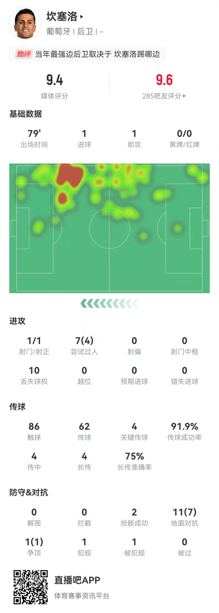 坎塞洛本场1球1助攻+4关键传球2造良机 12对抗8成功 获评9.4分