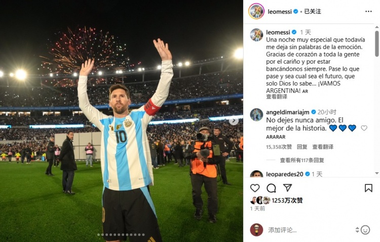 9月7日讯 梅西在Instagram发文谈国家队主场告别战,迪马利亚在评论区送上祝福。梅西写道:“一个令我激动到至今仍无...