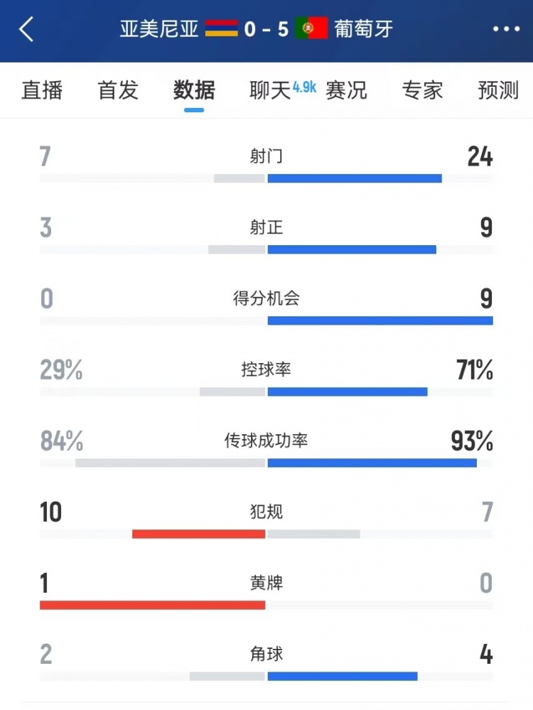 葡萄牙全场数据:控球率71%,射门24-7、射正9-3、得分机会9-0