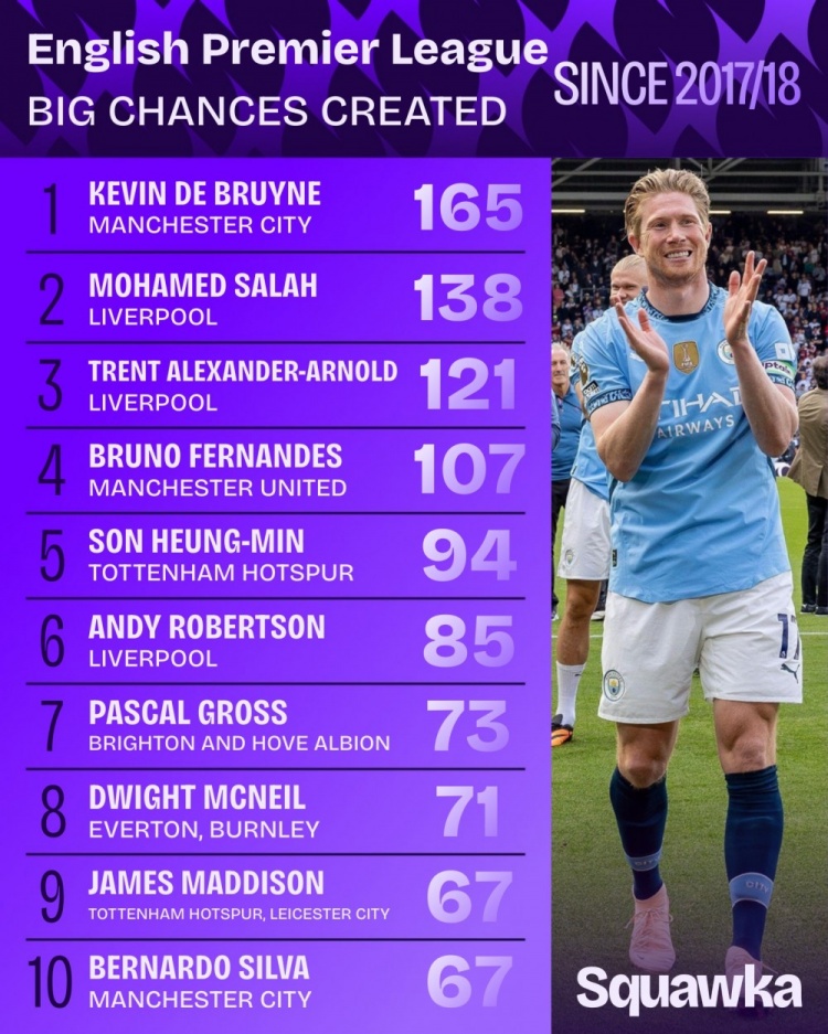 9月7日讯 数据机构squakwa统计了17-18赛季以来的英超创造重大机会情况,德布劳内力压萨拉赫居首。英超近9年创造...