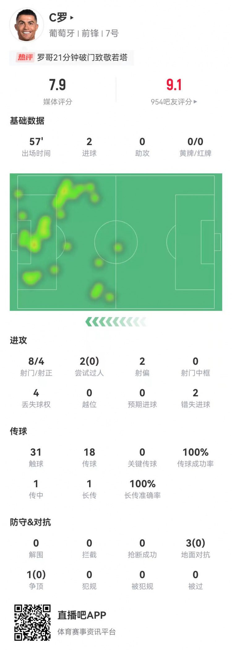 C罗本场8射4正进2球+2失良机 4对抗&2过人全失败 获评7.9分