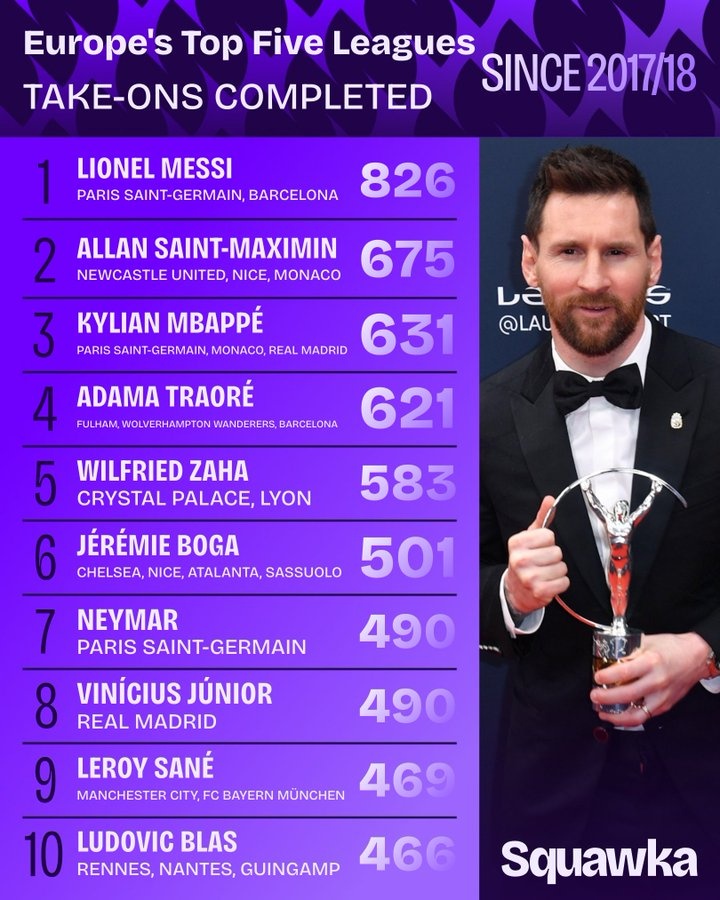 2017-18赛季至今五大联赛球员过人排名:梅西826次断层领先