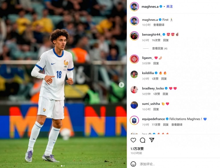 9月6日讯 法国队在本轮世预赛2-0力克乌克兰,边锋阿克利乌舍最后替补登场完成首秀。他也在赛后通过社媒晒出自己的比赛照,...