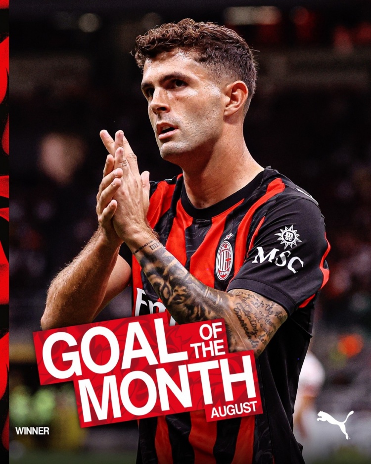 普利西奇对阵巴里转身扫射破门,当选米兰8月最佳进球
