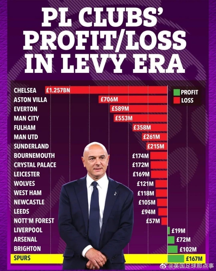 英超俱乐部在列维时代的盈亏榜:热刺盈利1.67亿镑,排第一!💰