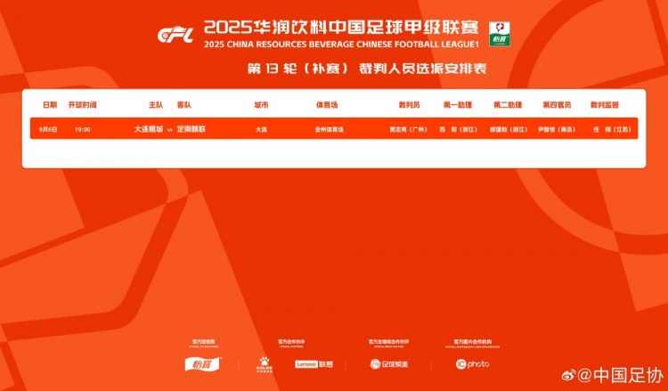 官方:贾志亮将担任中甲第13轮补赛大连鲲城vs定南赣联主裁判