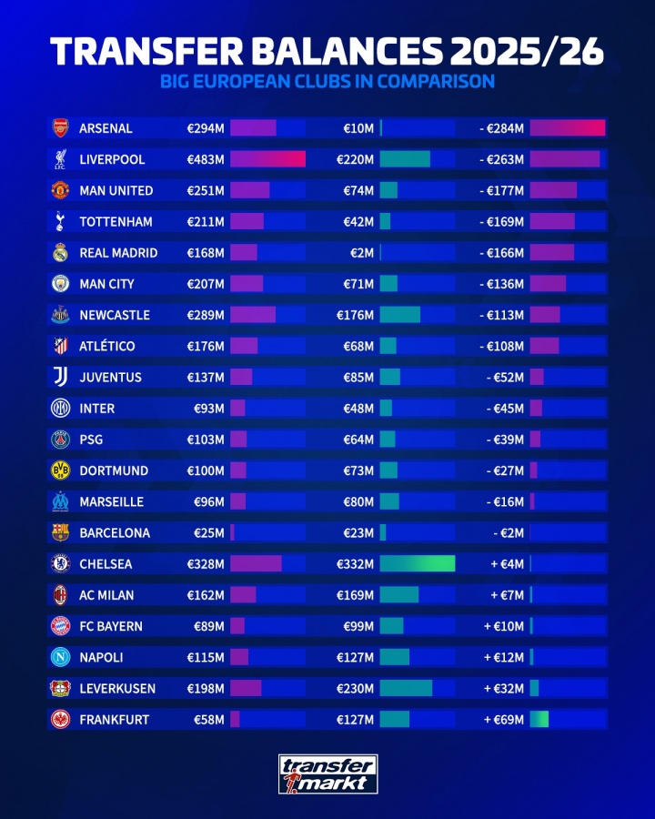 英超霸榜!夏窗净投入排行:枪手2.84亿居首,红军第2,曼联第3