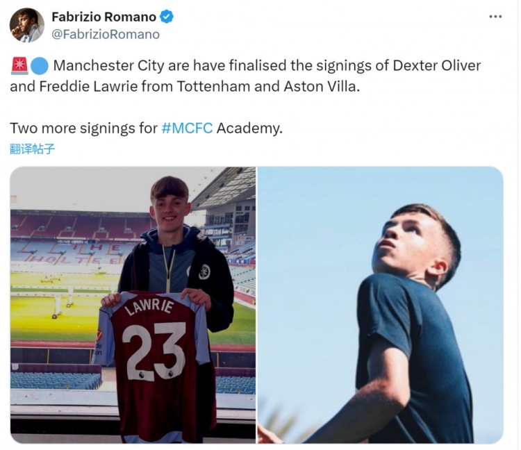 罗马诺:曼城签下热刺16岁中场奥利弗、维拉16岁中卫劳里