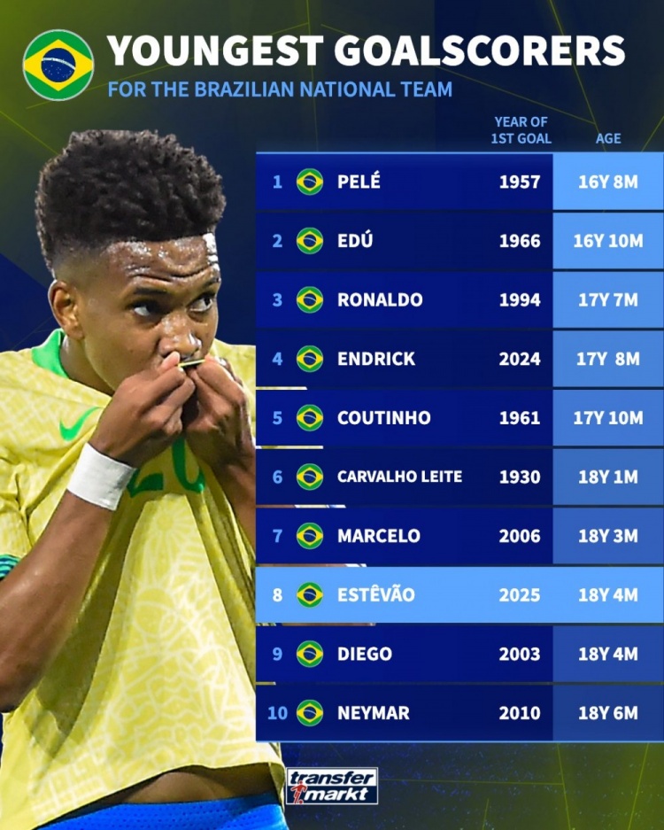 9月5日讯 巴西在本轮世预赛3-0完胜智利,小将埃斯特旺打进国家队生涯处子球。《转会市场》也统计了巴西队史的最年轻进球者...