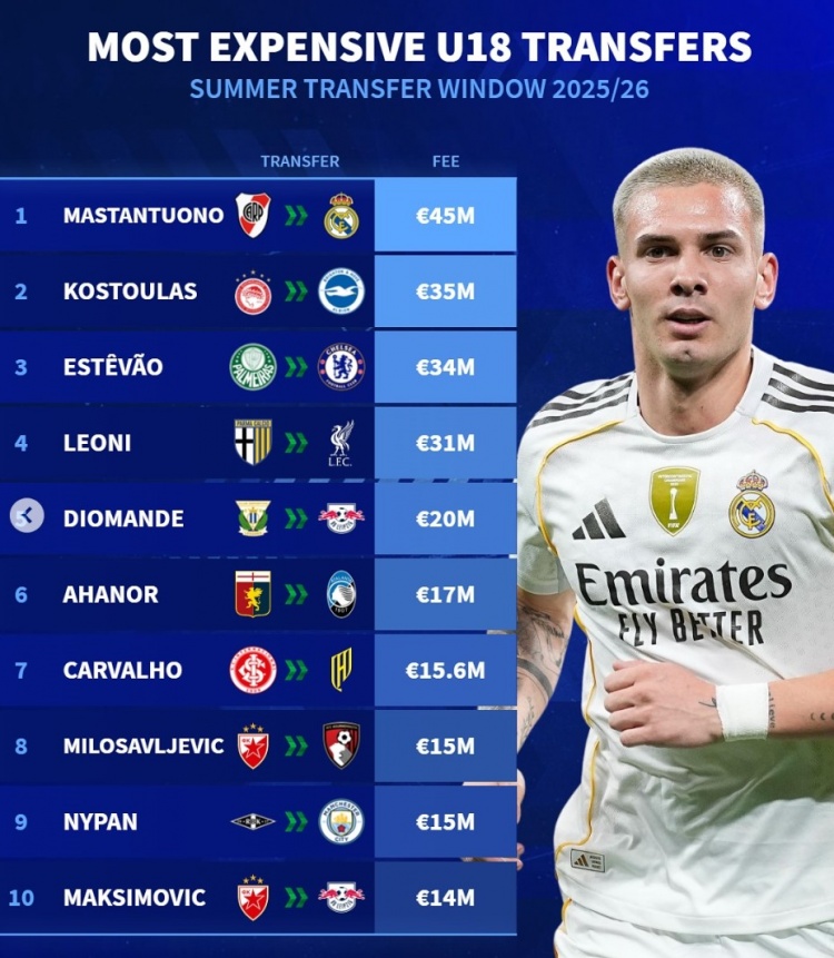 德转列今夏U18最贵转会榜:马斯坦托诺居首,埃斯特旺&莱奥尼在列