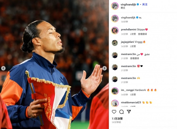 9月5日讯 荷兰在本轮世预赛主场1-1遭波兰绝平,34岁的荷兰队长范迪克在赛后通过社媒晒出多张比赛照。其中,他还晒出了一...