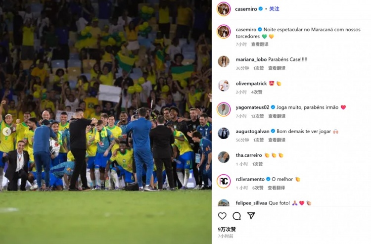 完胜!卡塞米罗社媒晒全队合照:和球迷在马拉卡纳度过精彩的夜晚