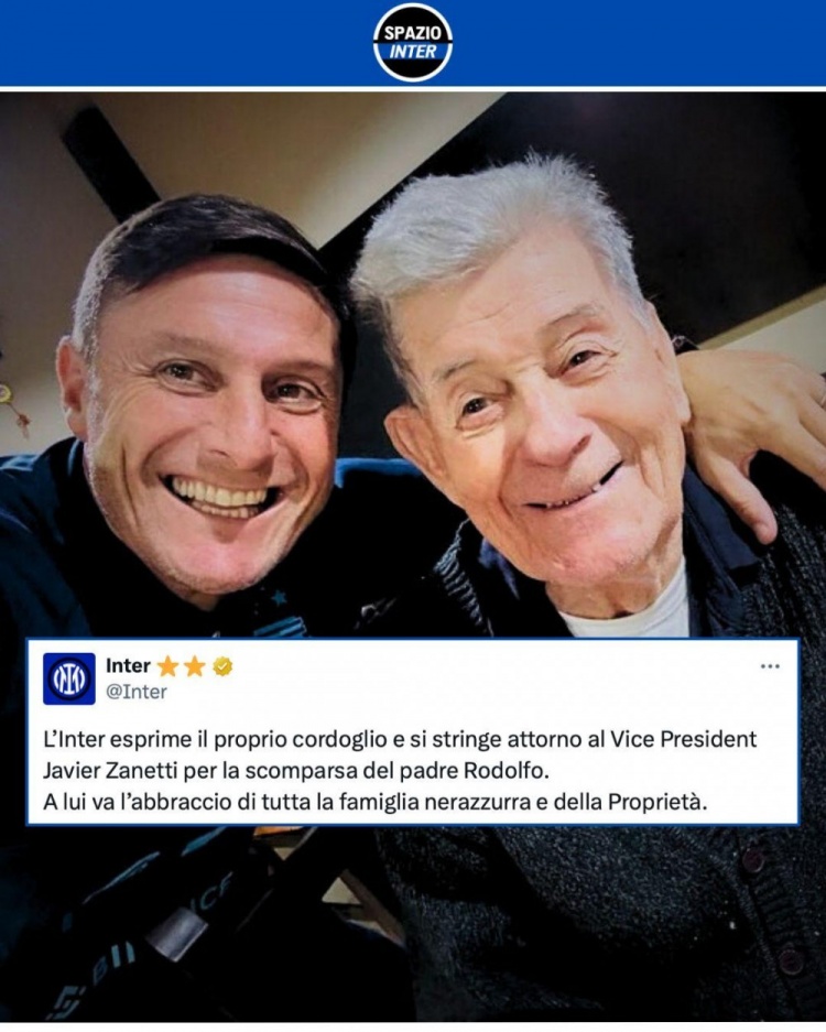 萨内蒂父亲去世,国米官方:向萨内蒂致以诚挚的哀悼