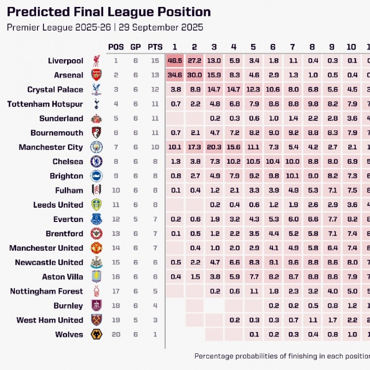 Opta预测英超夺冠概率:利物浦46.5%居首,阿森纳逆转后升至34.6%