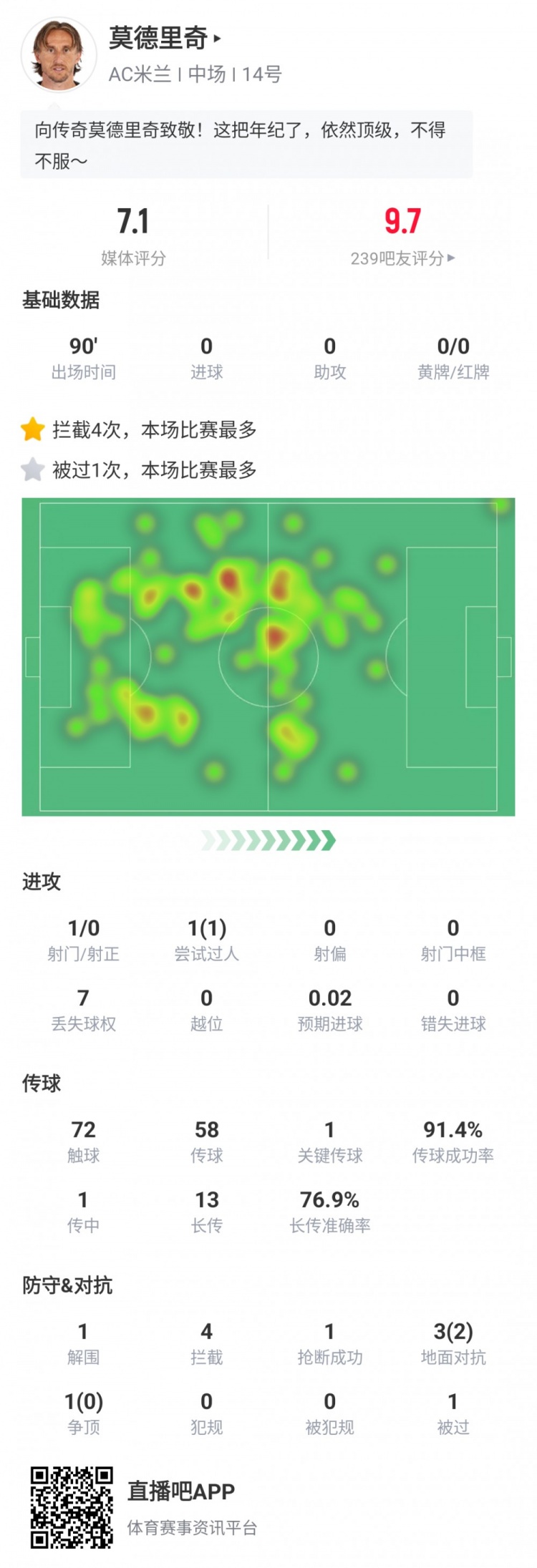 能攻能守!莫德里奇本场数据:传球成功率91.4%,4次拦截本场最多