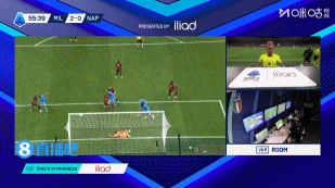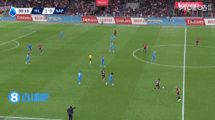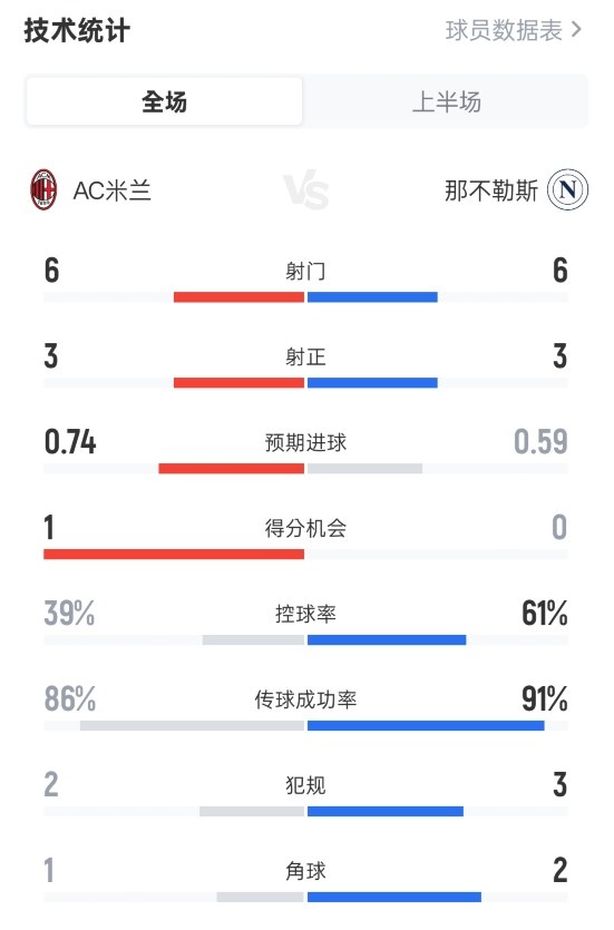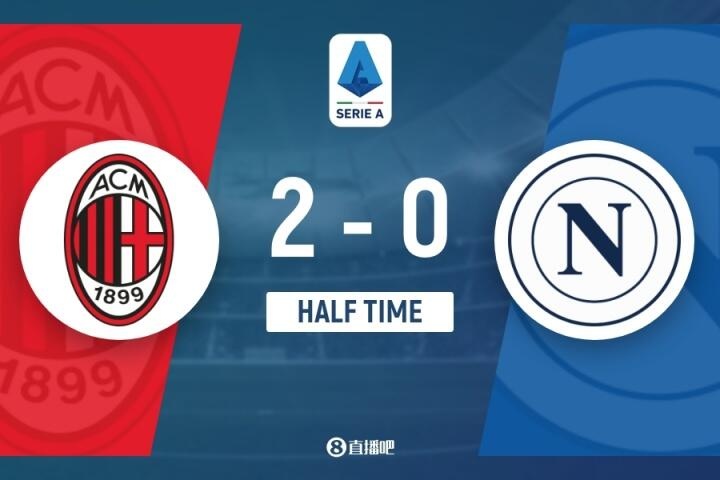 米兰半场2-0那不勒斯数据:射门6-6,射正3-3,控球率39%-61%