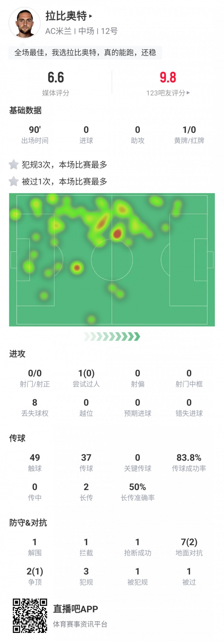9月29日讯 米兰在本轮意甲2-1击败那不勒斯,首发出场的拉比奥特踢满90分钟,以下是他的个人数据。0次射门、1次尝试过...