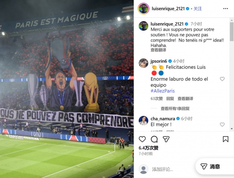 功勋主帅!巴黎球迷巨型TIFO致敬主帅恩里克,后者社媒致谢