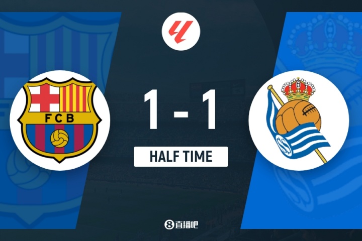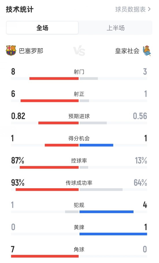 巴萨半场1-1皇家社会数据:射门8-3,射正6-1,控球率87%-13%