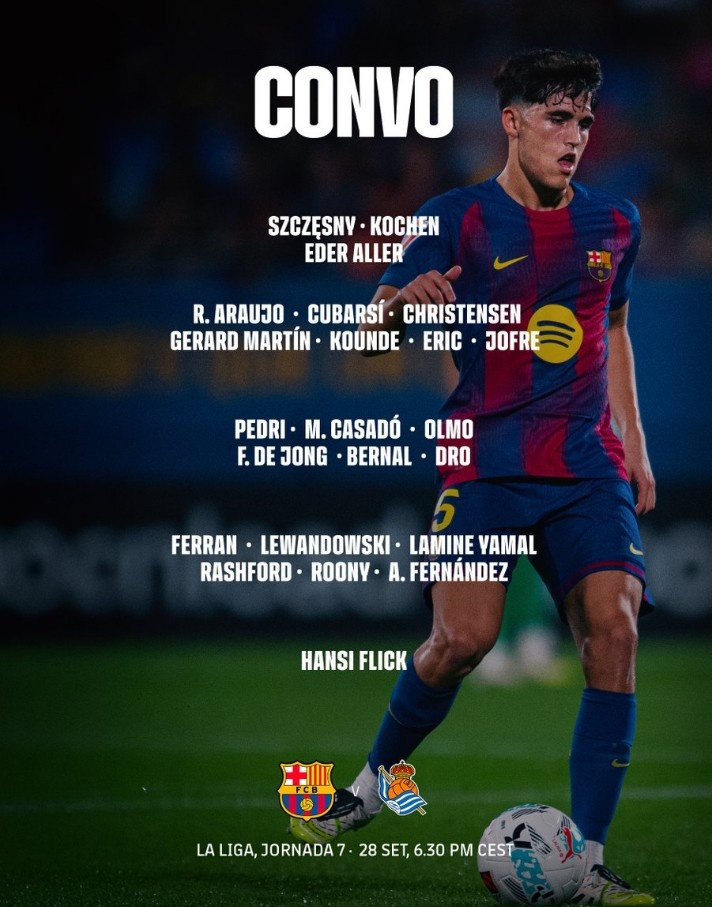 9月28日讯 巴萨本轮西甲将迎战皇家社会,球队官方也公布了本场球队大名单,亚马尔回归,拉菲尼亚、门将霍安-加西亚缺席。具...