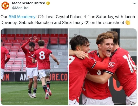 5战全胜!曼联U21队4-1水晶宫U21队,领跑联赛积分榜