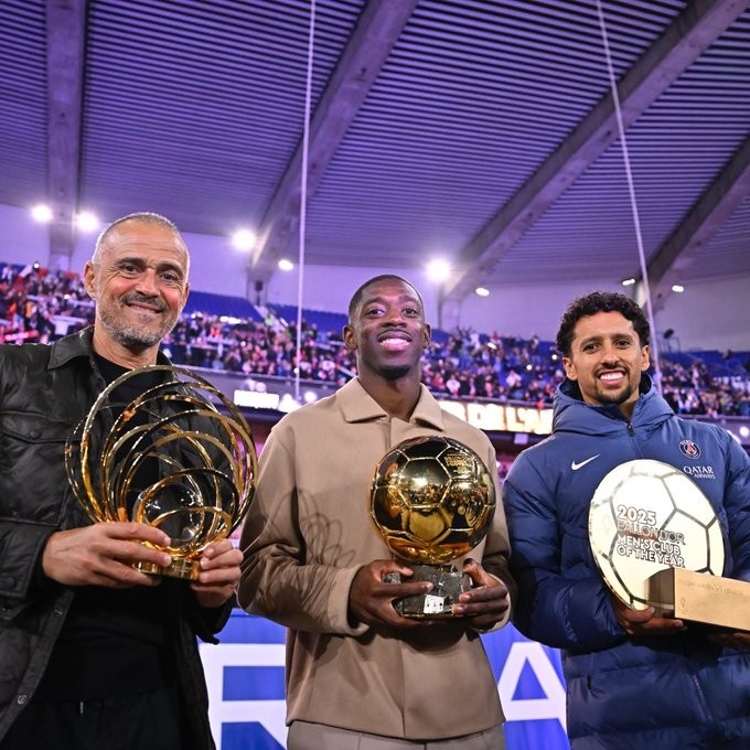 巴黎晒恩里克、登贝莱、马尔基尼奥斯+三奖项合影:集体的力量