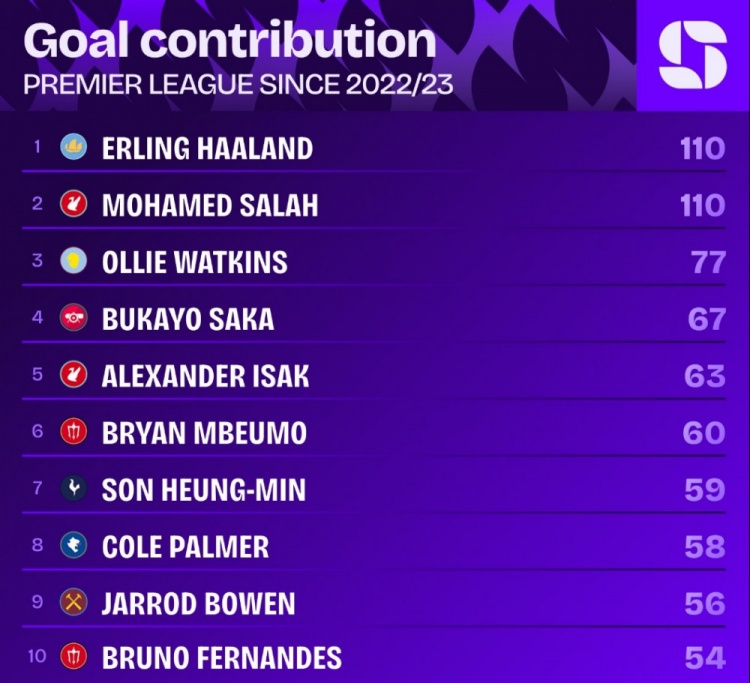 哈兰德加盟曼城以来已经参与110粒英超进球,同期无人比他更多