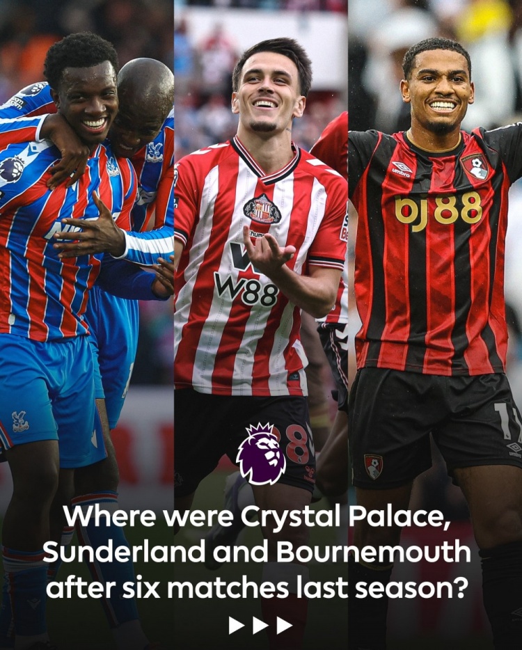 9月28日讯 英超官方更新社媒动态,称赞水晶宫、桑德兰、伯恩茅斯本赛季的表现。英超官方对比三队上赛季前6轮、本赛季前6轮...